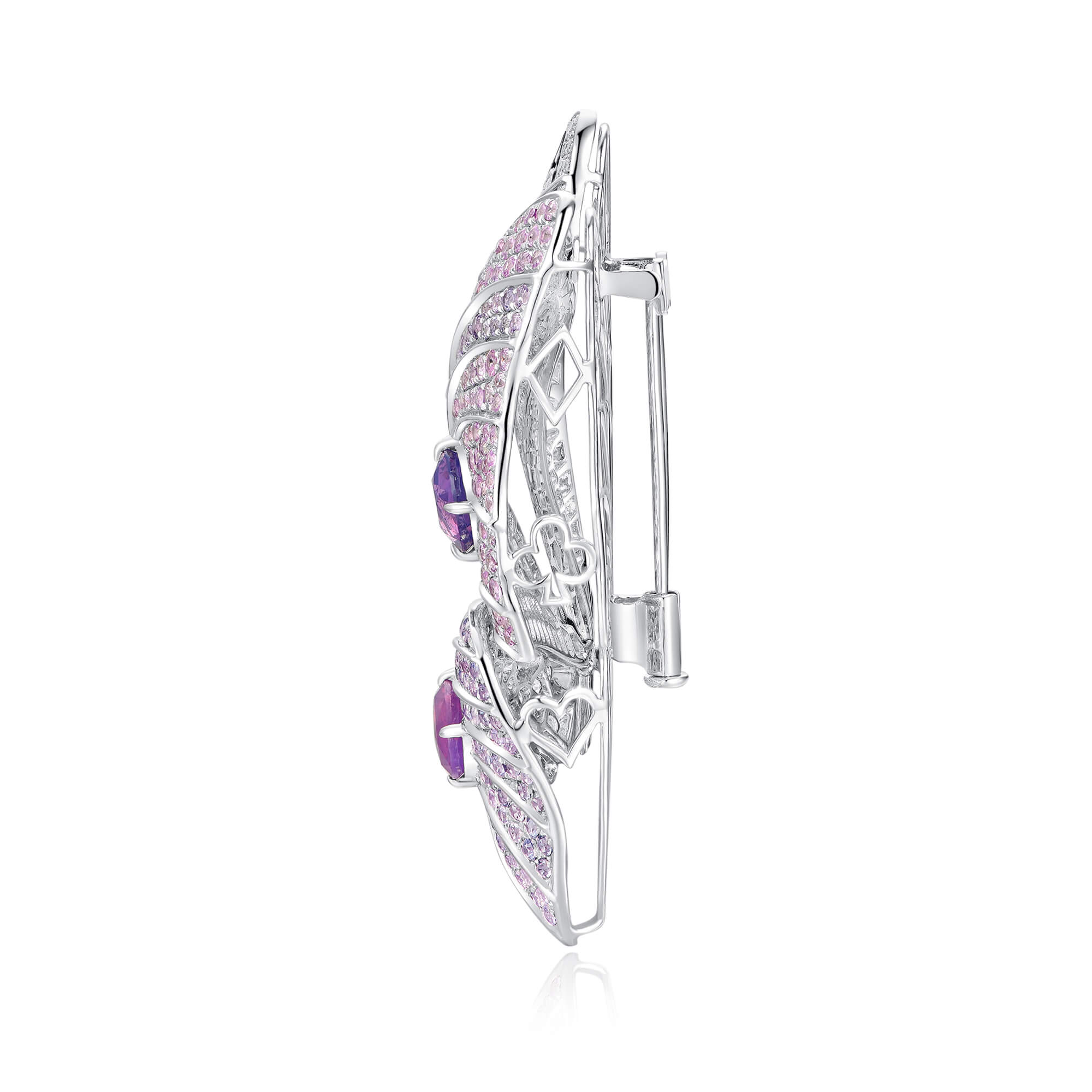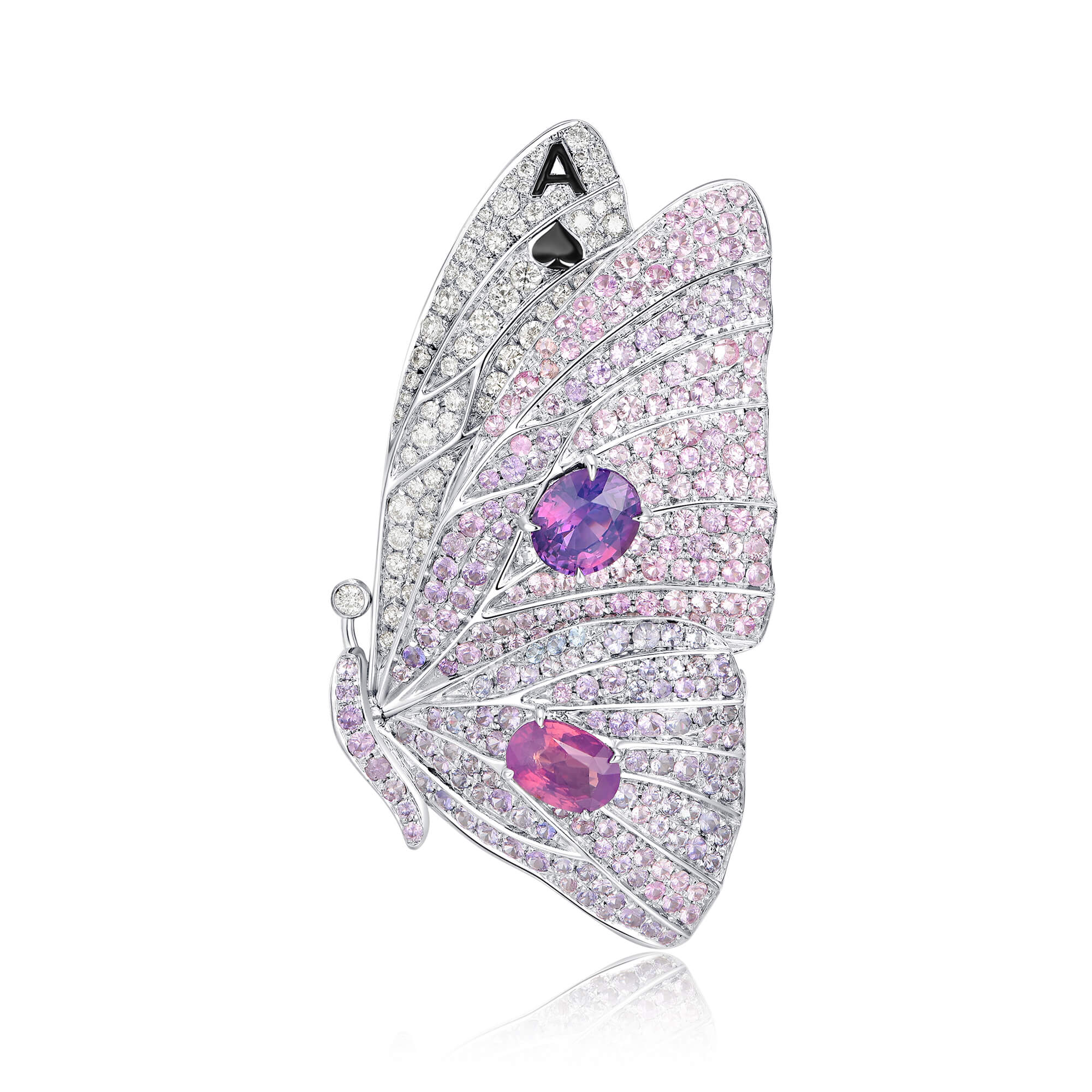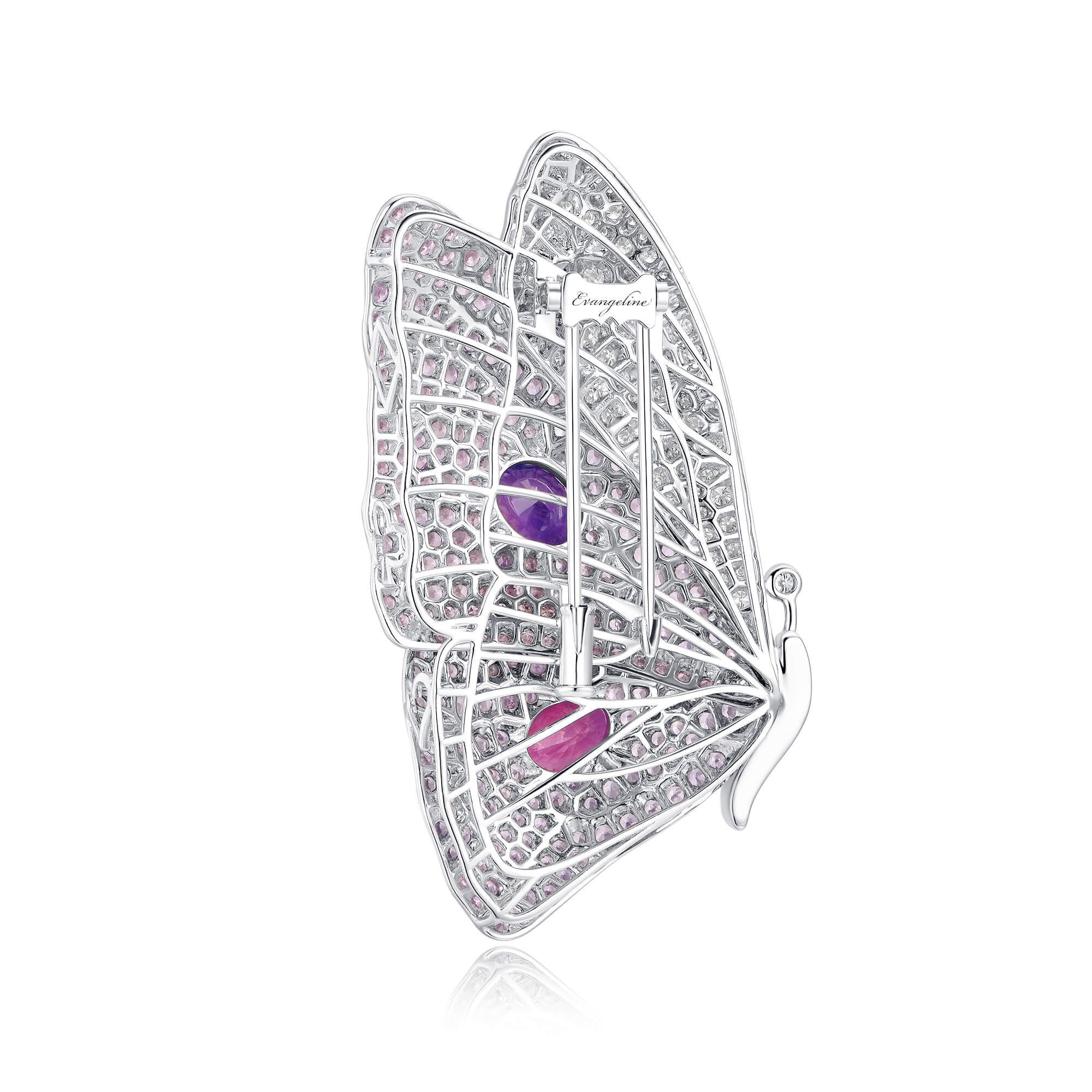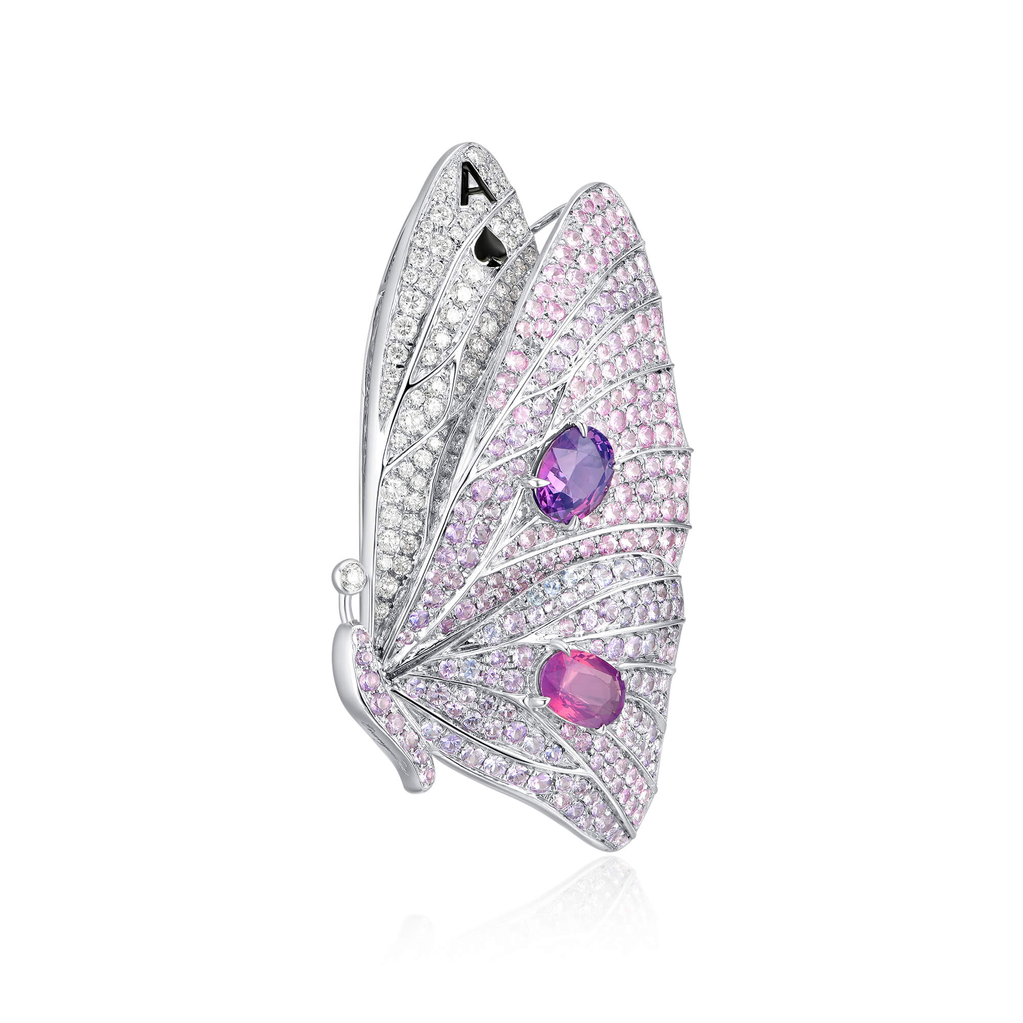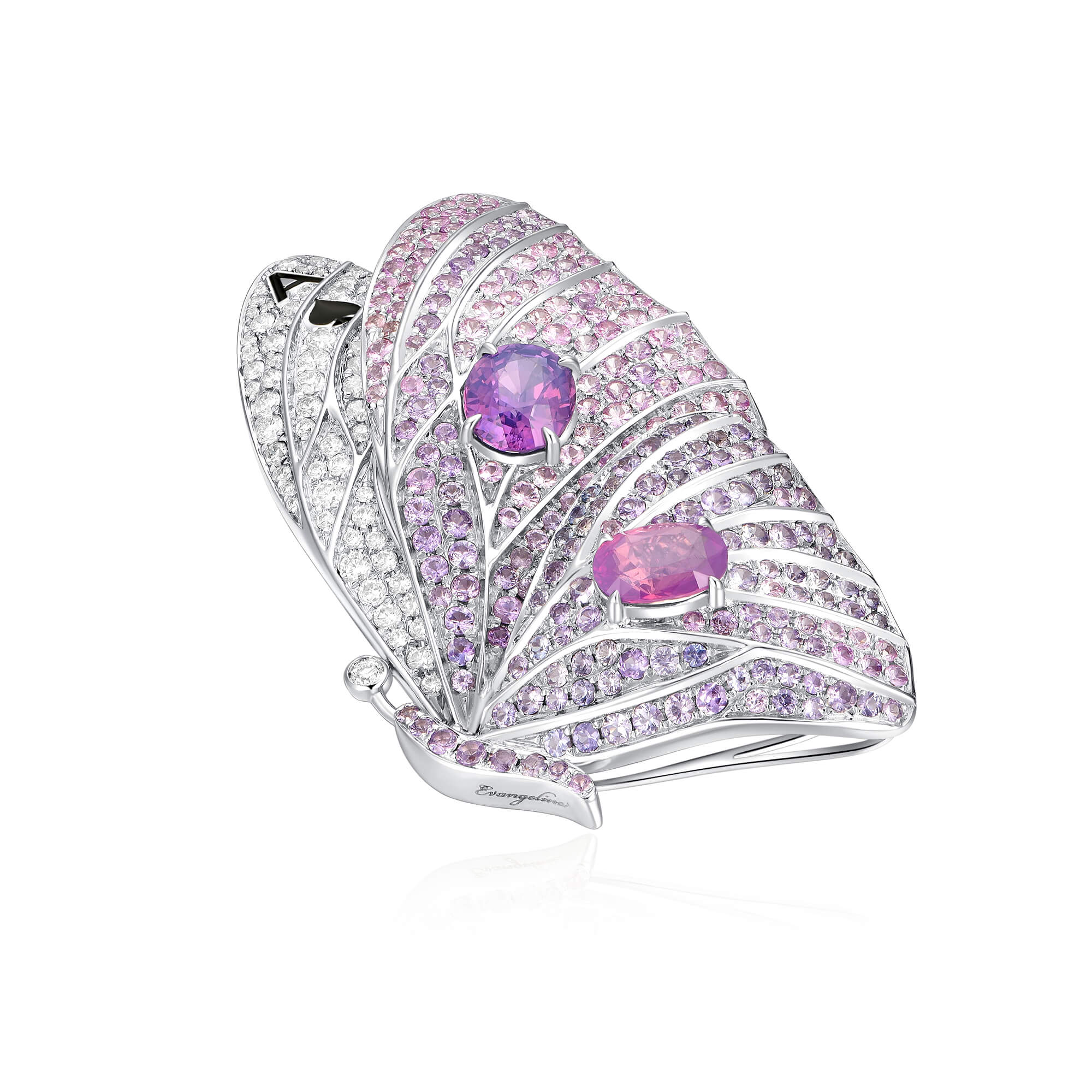 At its heart lie two exquisite sapphires in pink and purple, anchoring a dreamlike palette. The wings unfurl in a mesmerizing ombré of pinks, violets, and cerulean blues, a chromatic symphony that echoes the fantasy of a magical realm while perfectly complementing the center stones.