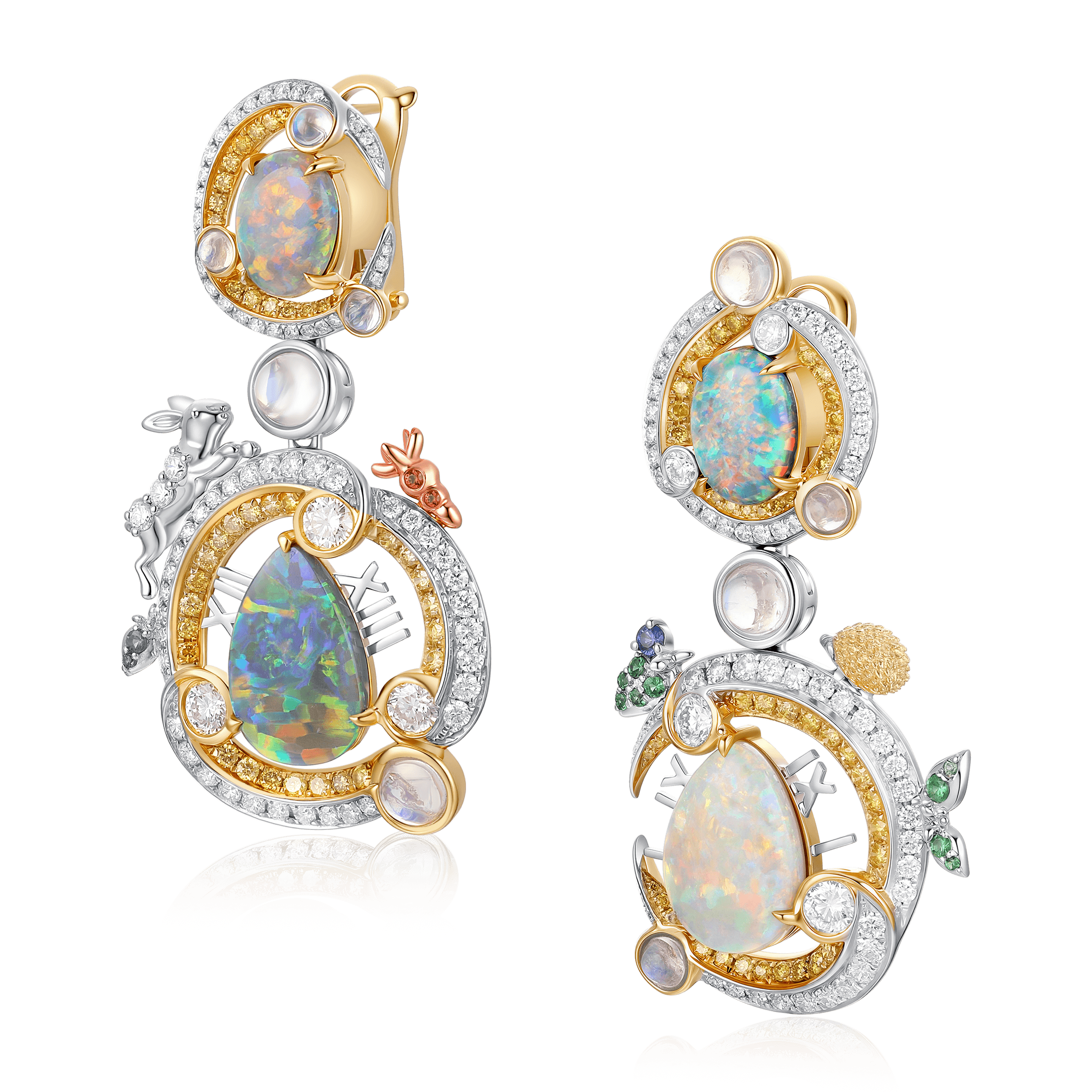 The design is a masterclass in asymmetrical balance,exploring the cyclical romance of the sun and moon. The left earring features adiamond crescent moon cradling a luminous oval White Opal above, while ablazing diamond sun contour holds a mysterious pear-shaped Black Opal below.The right earring playfully mirrors this composition in reverse, creating adynamic equilibrium of light and shadow.